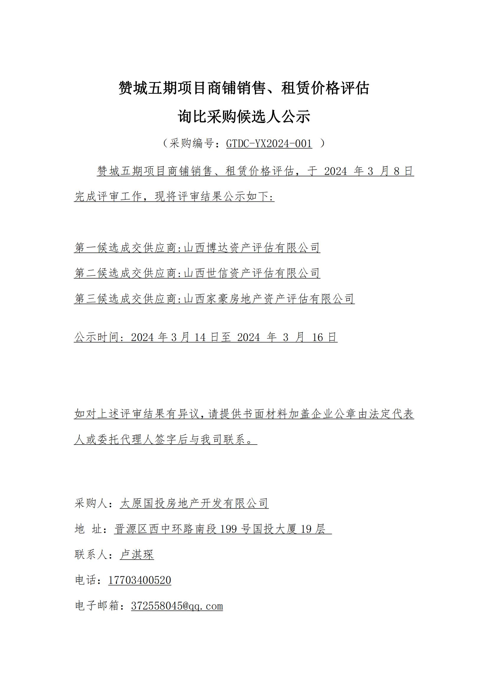 贊城五期項目商鋪銷售、租賃價格評估詢比采購候選人公示