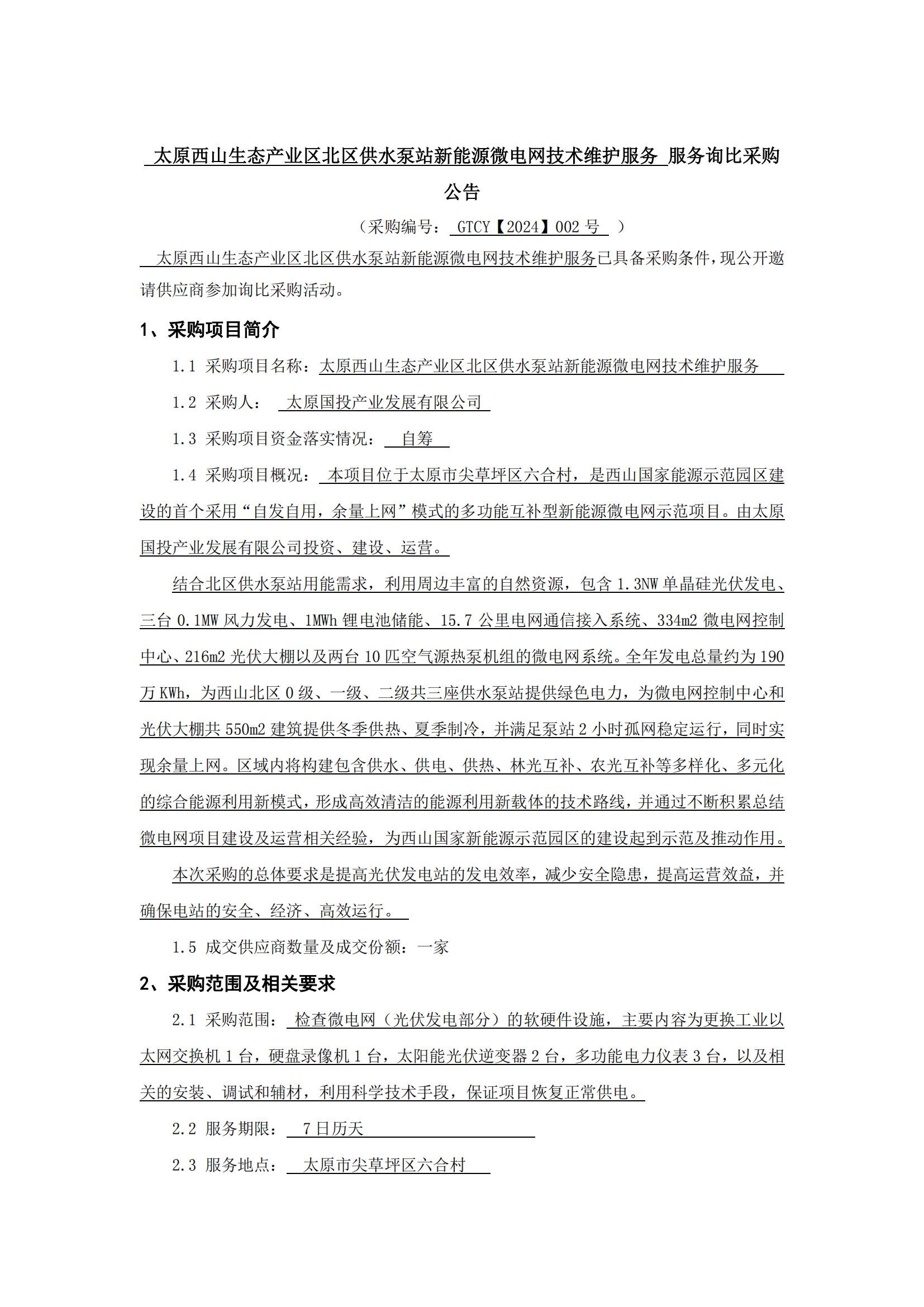 太原西山生態產業區北區供水泵站新能源微電網技術維護服務服務詢比采購公告