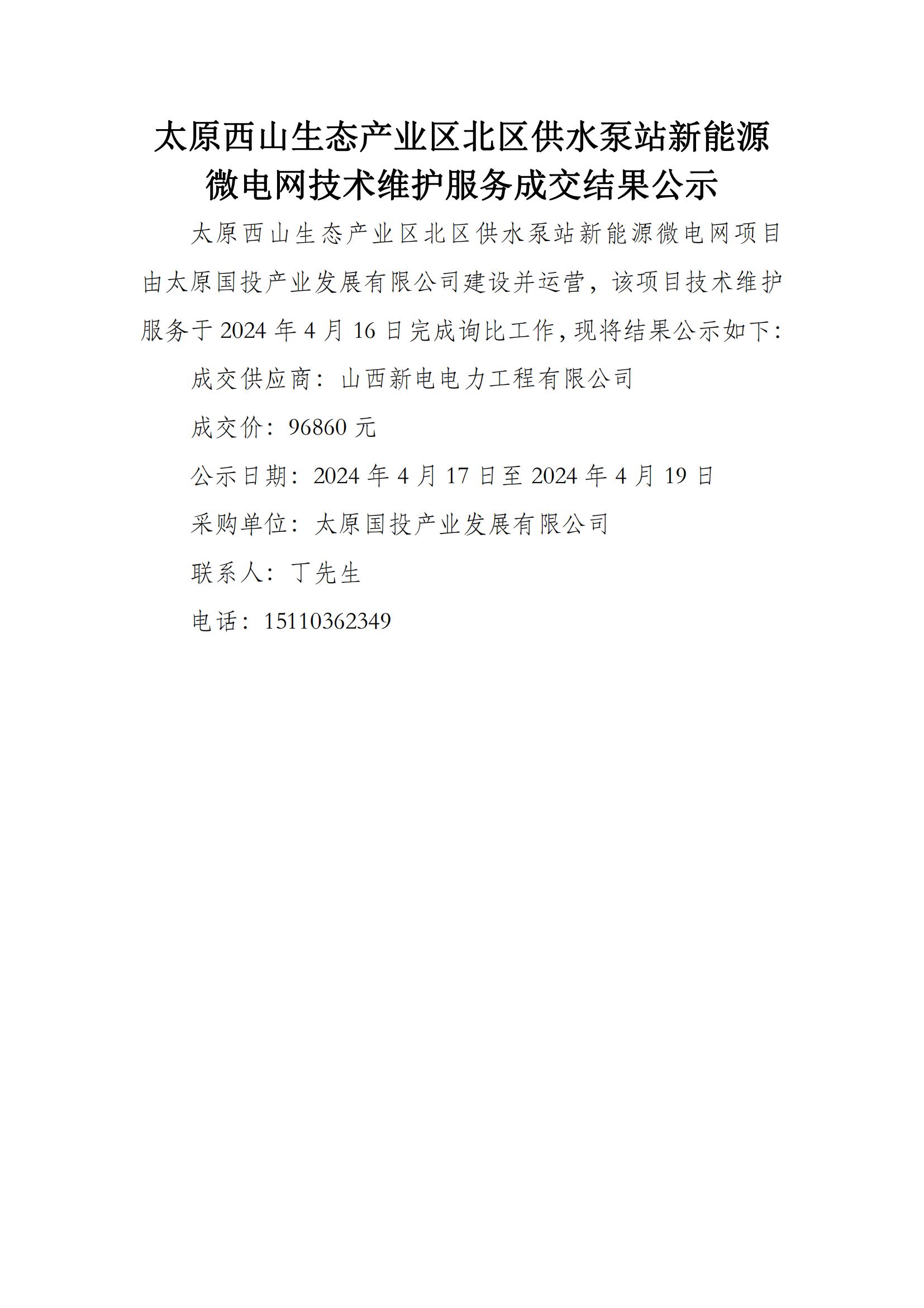 太原西山生態產業區北區供水泵站新能源微電網技術維護服務成交結果公示