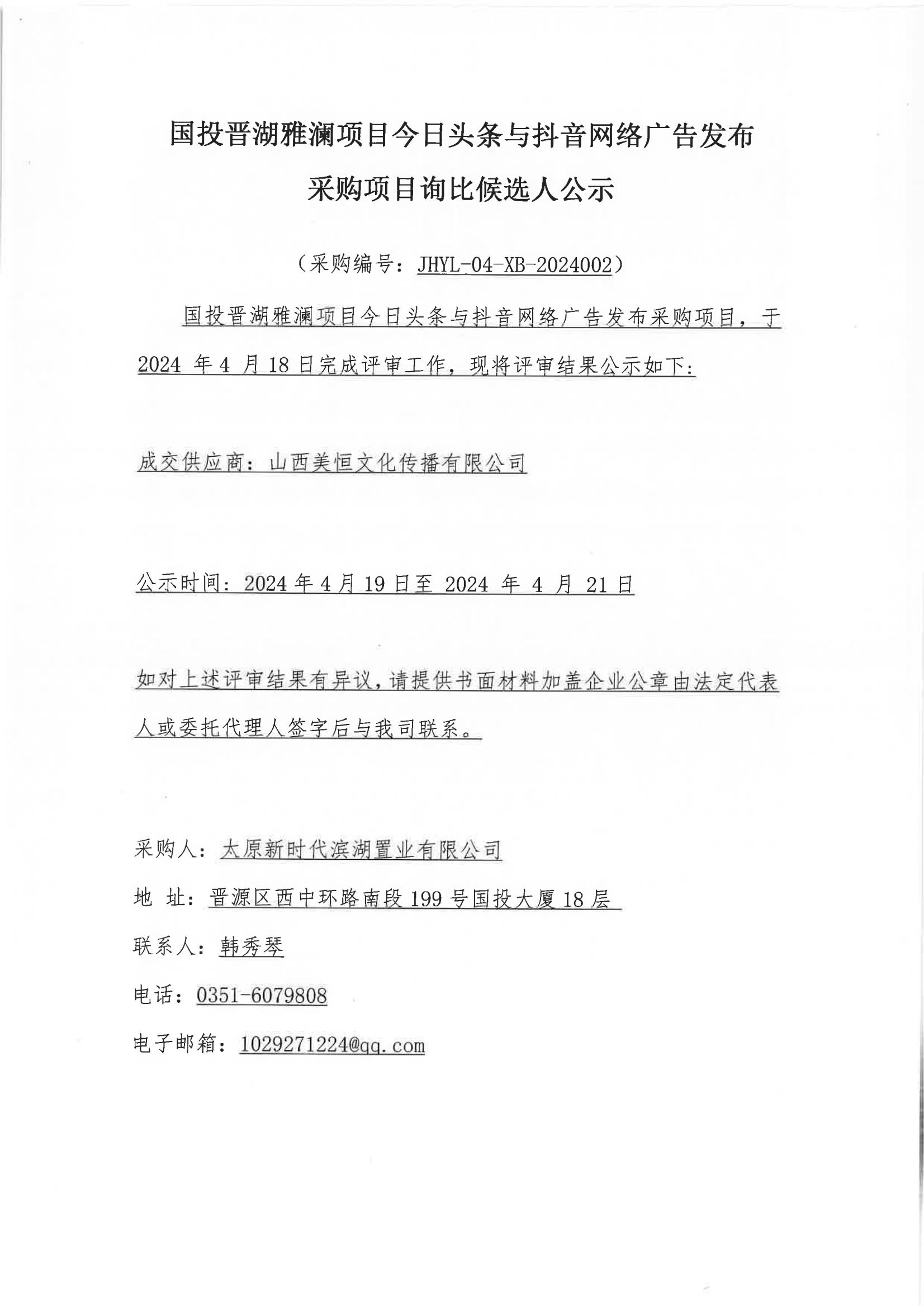 國投晉湖雅瀾項目今日頭條與抖音網絡廣告發布采購項目詢比候選人公示