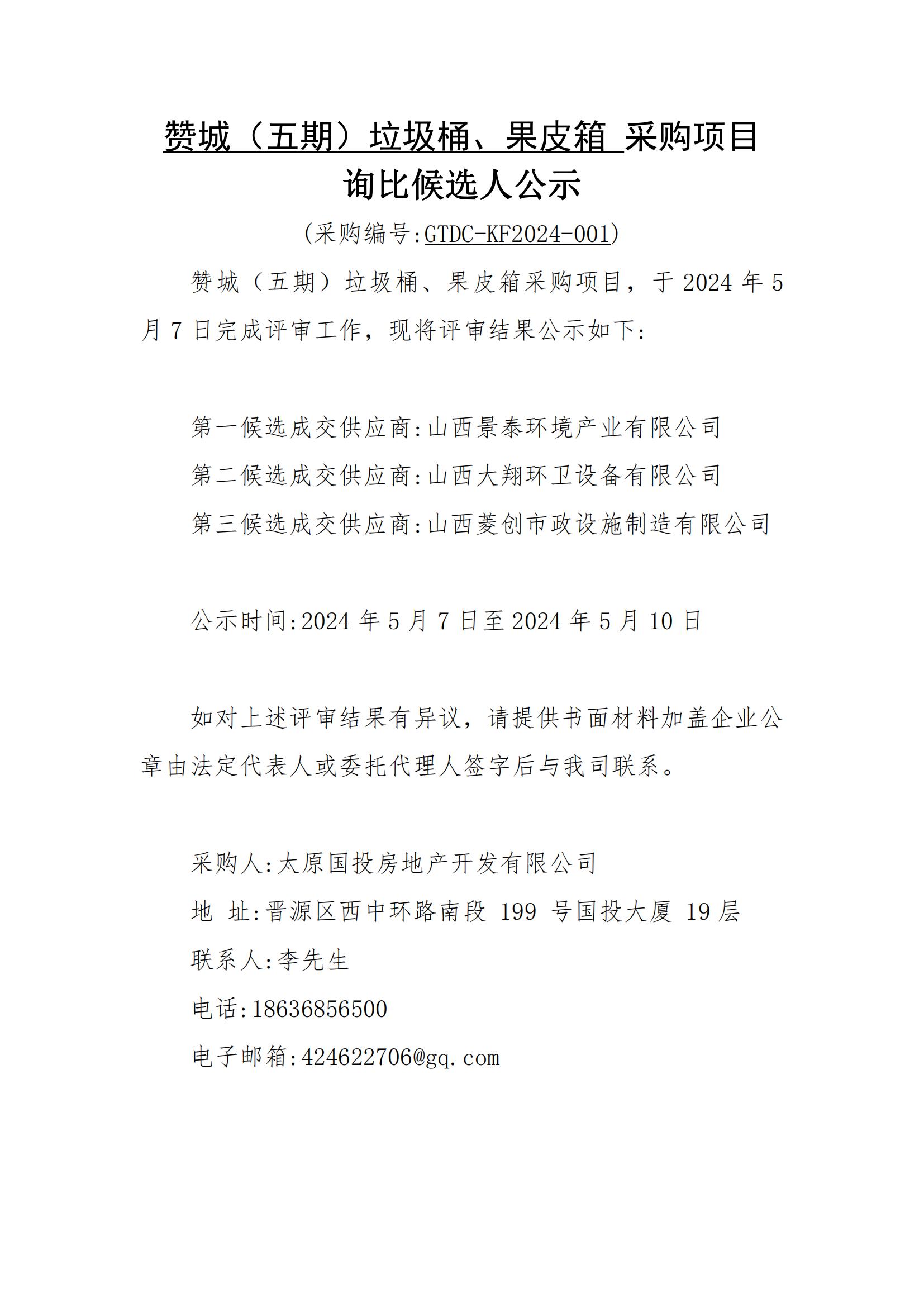 贊城五期垃圾桶、果皮箱采購(gòu)項(xiàng)目詢比候選人公示