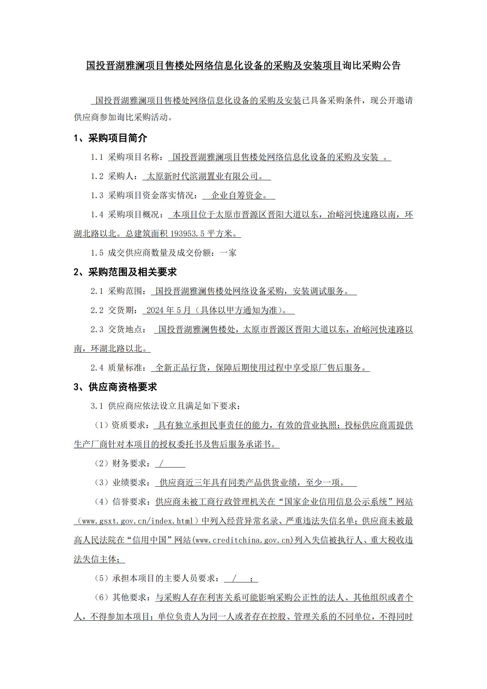 國(guó)投晉湖雅瀾項(xiàng)目售樓處網(wǎng)絡(luò)信息化設(shè)備的采購(gòu)及安裝項(xiàng)目詢比采購(gòu)公告