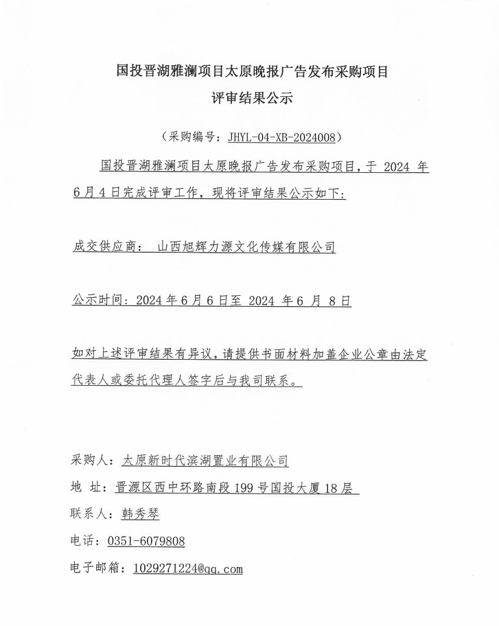 國(guó)投晉湖雅瀾項(xiàng)目太原晚報(bào)廣告發(fā)布采購(gòu)項(xiàng)目結(jié)果公示