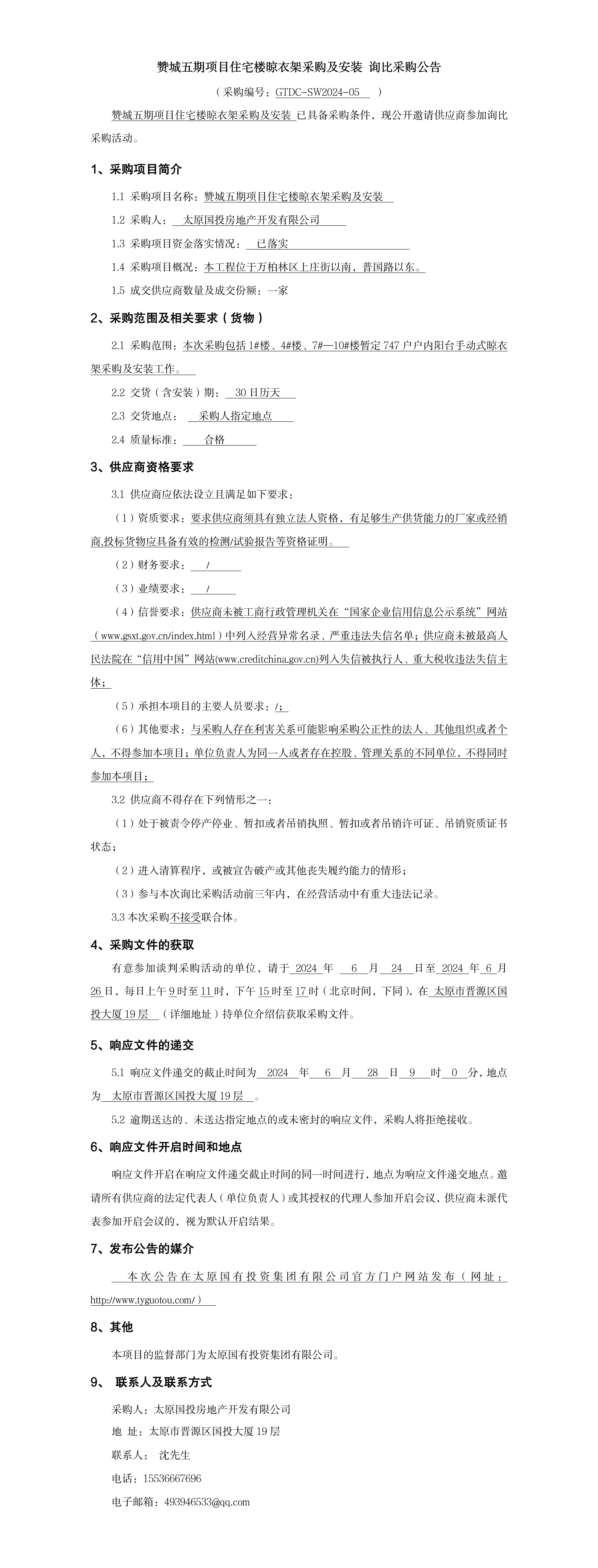 贊城五期項目住宅樓晾衣架采購及安裝詢比采購公告