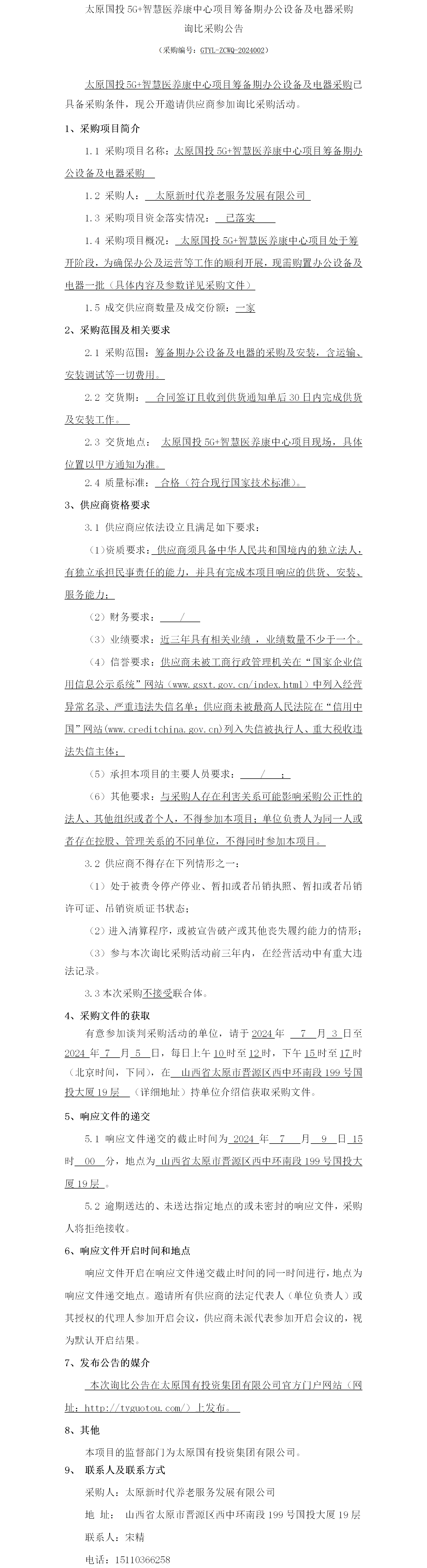 太原國投5G+智慧醫養康中心項目籌備期辦公設備及電器采購詢比采購公告