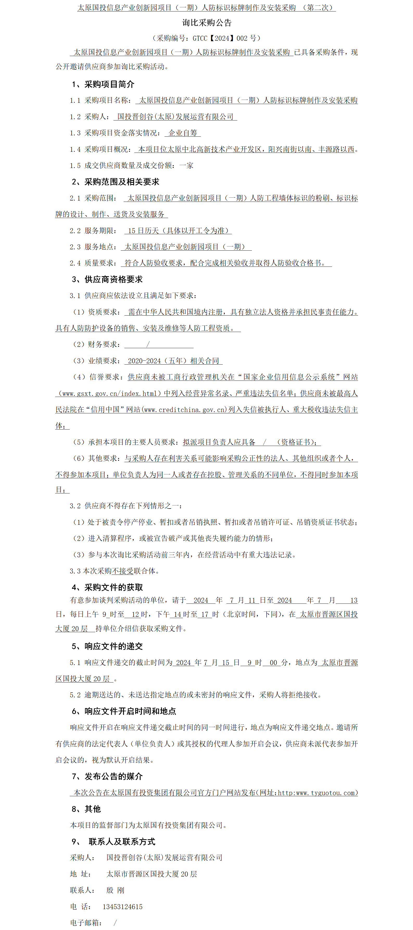 太原國投信息產業創新園項目(一期)人防標識標牌制作及安裝采購(第二次) 詢比采購公告