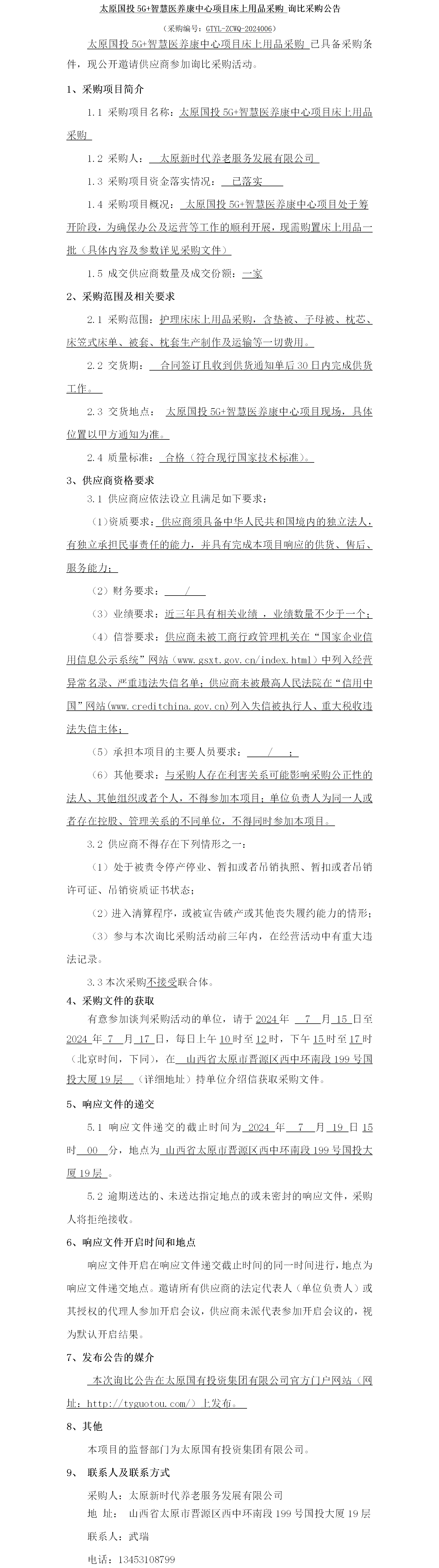 太原國投5G+智慧醫養康中心項目床上用品采購 詢比采購公告