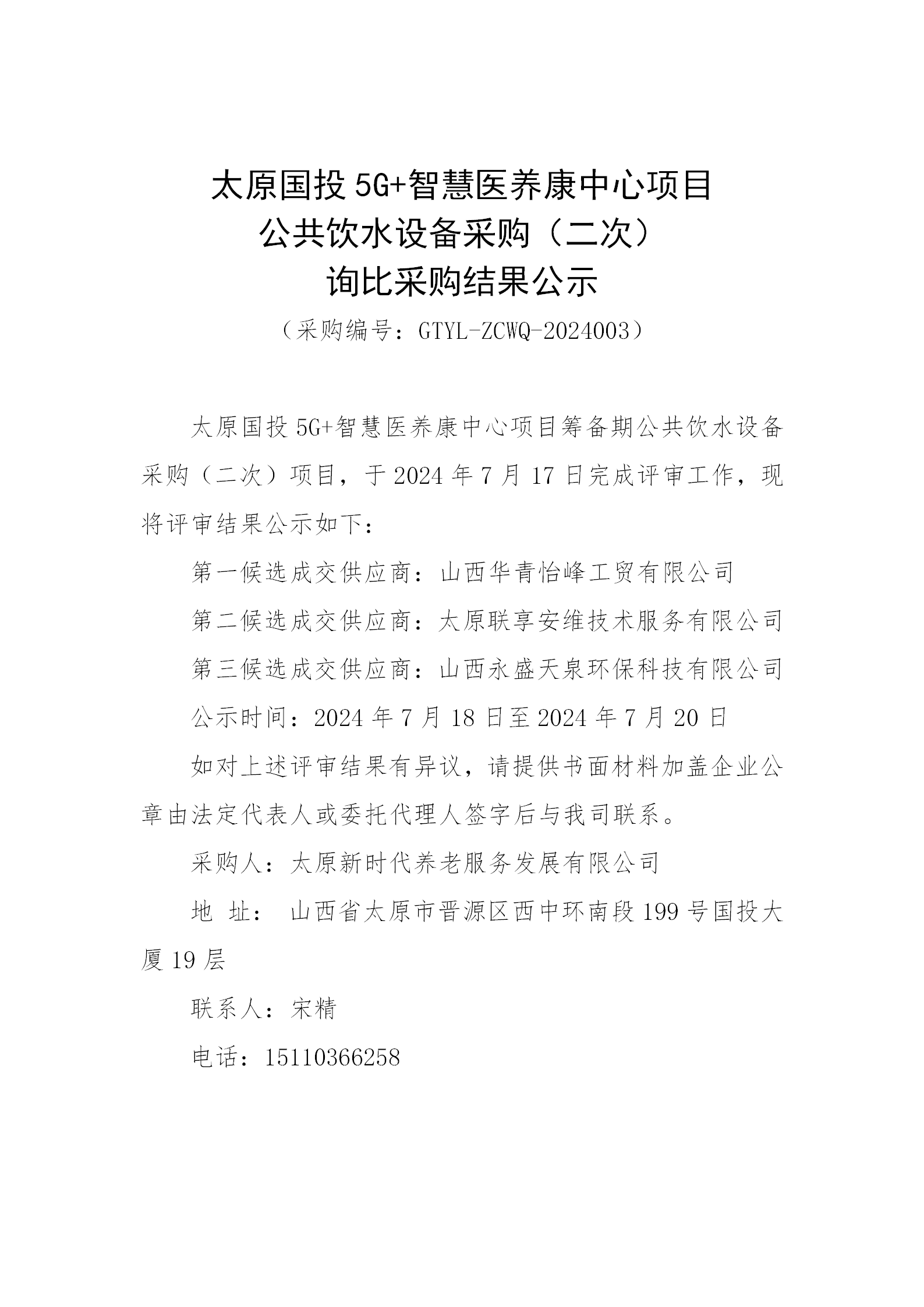 太原國投5G+智慧醫(yī)養(yǎng)康中心項目公共飲水設備采購(二次)詢比采購結果公示