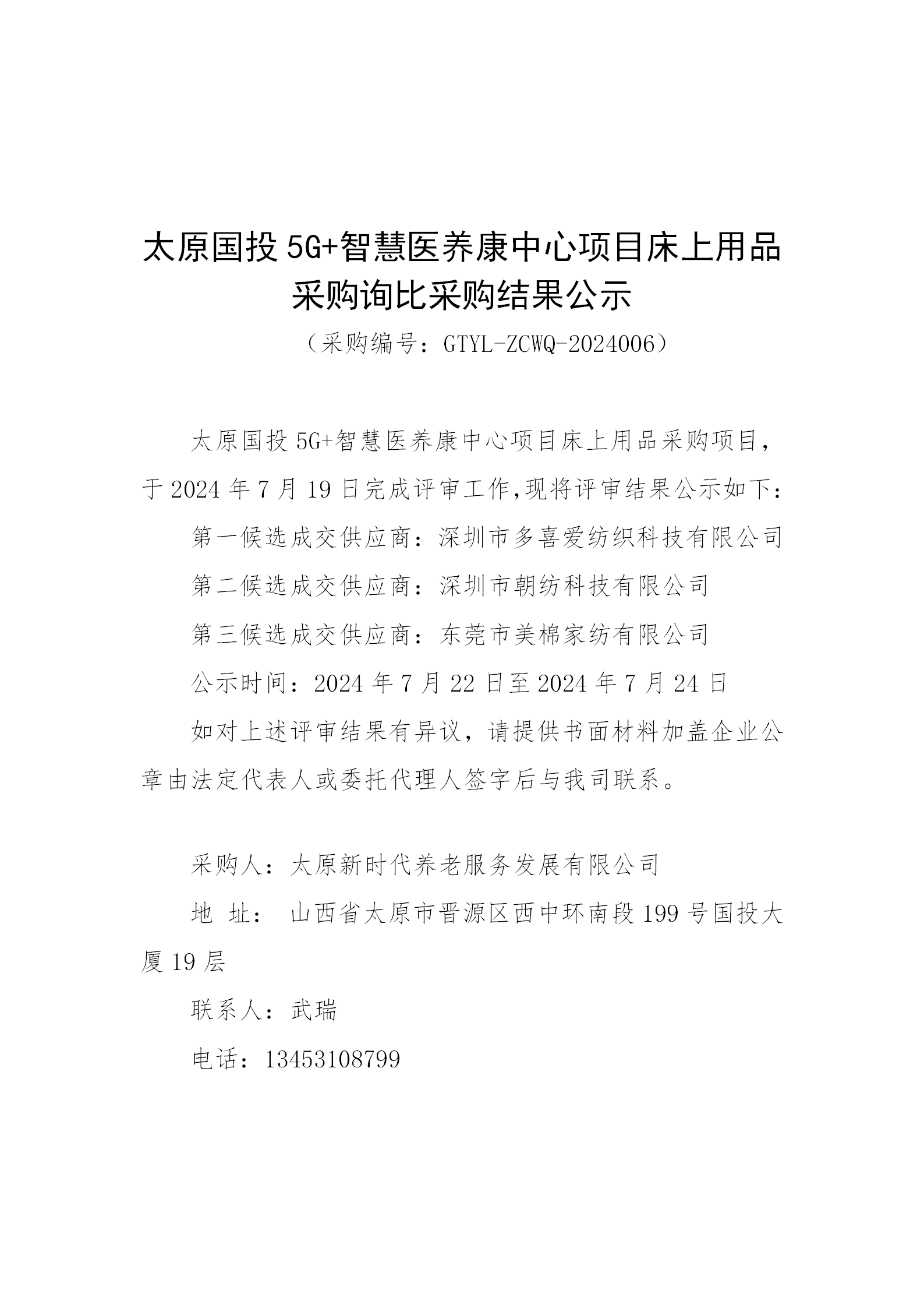 太原國投5G+智慧醫養康中心項目床上用品采購詢比采購結果公示