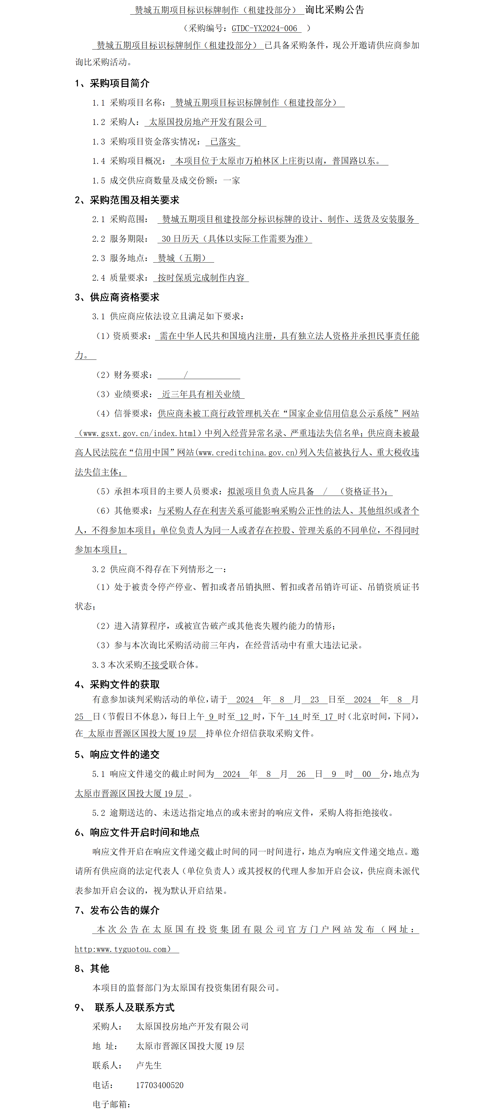 贊城五期項目標識標牌制作(租建投部分)詢比采購公告