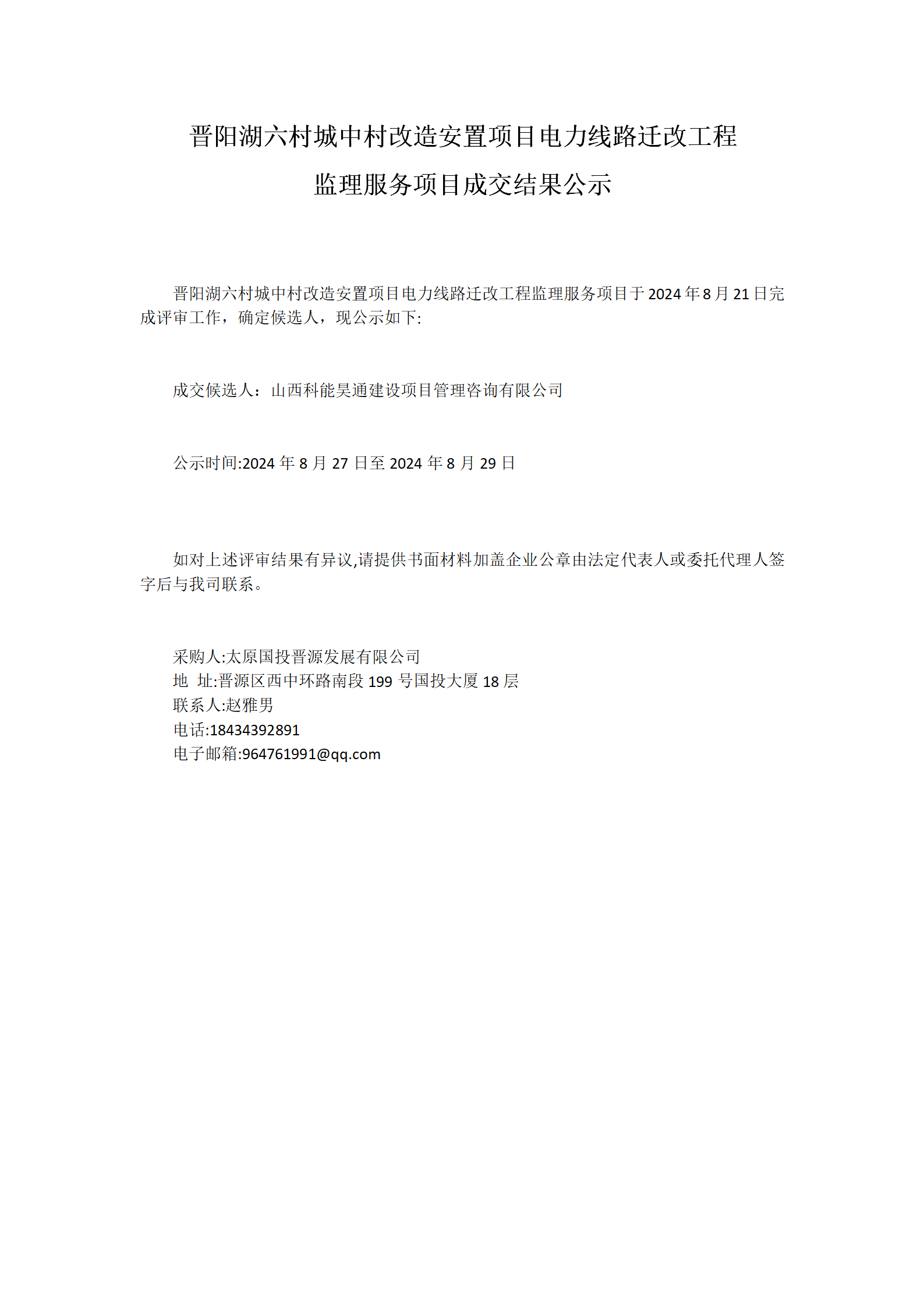 晉陽湖六村城中村改造安置項目電力線路遷改工程監(jiān)理服務(wù)項目成交結(jié)果公示