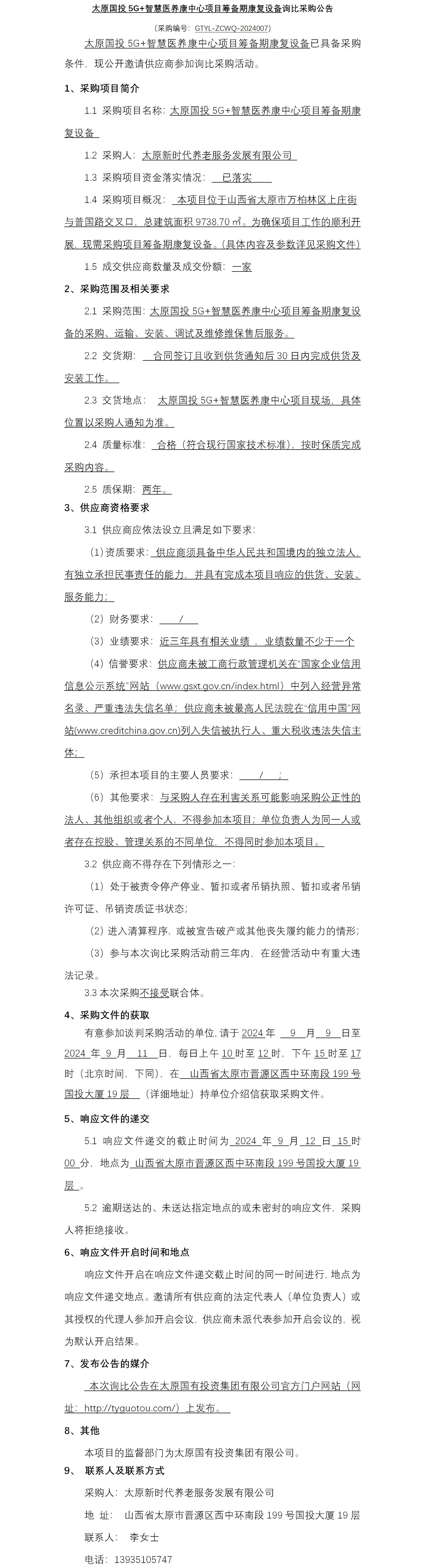 太原國投5G+智慧醫養康中心項目籌備期康復設備詢比采購公告