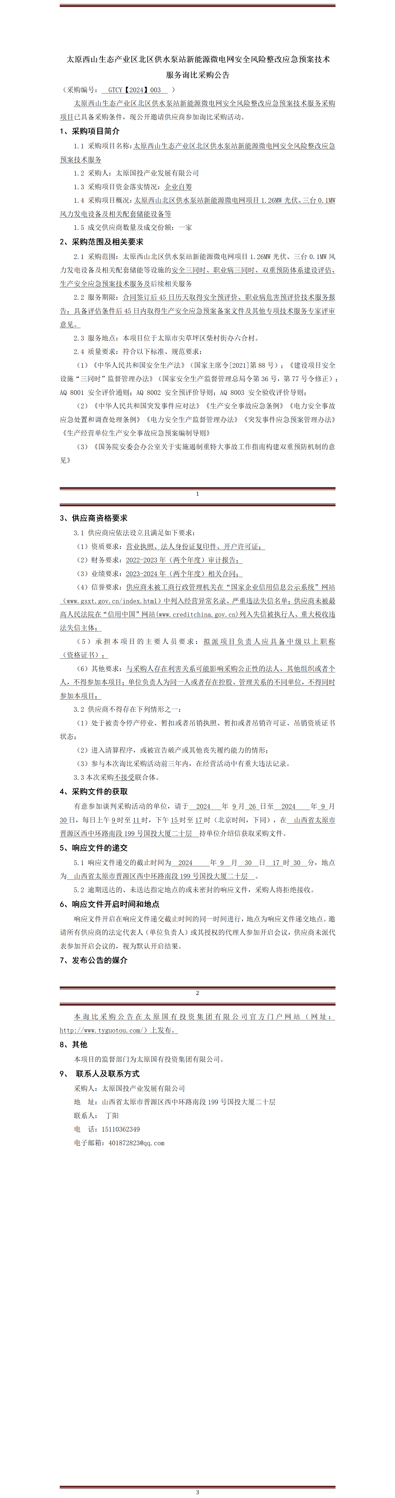 太原西山生態(tài)產業(yè)區(qū)北區(qū)供水泵站新能源微電網安全風險整改應急預案技術服務詢比采購公告